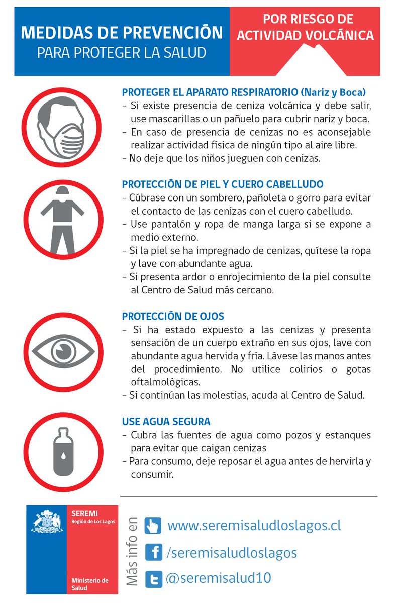 The following work presents the communicational strategy developed by the Health Seremi institution, during the health emergency due to the eruption of the Calbuco Volcano (Los Lagos Region, Chile) in April 2015, to diminish the risks of health for people and communities exposed to the eruption. A preventive and informative strategy was reported through various resources, including website social networks, as well as institutional transparency in terms of information towards the community regarding air quality, water and ash presence. The analysis of institutional social networks (twitter) indicates that the sanitary discursive cores were properly fitting and spread in this social network.